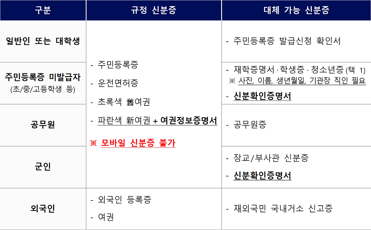2-3. 군인은 장교/부사관 신분증, 신분확인증명서(군복무확인서, 병적증명서 등은 인정 불가), 공무원은 공무원증, 외국인은 외국인등록증, 재외국민국내거소신고증으로 2-1.의 신분증을 대체할 수 있습니다.